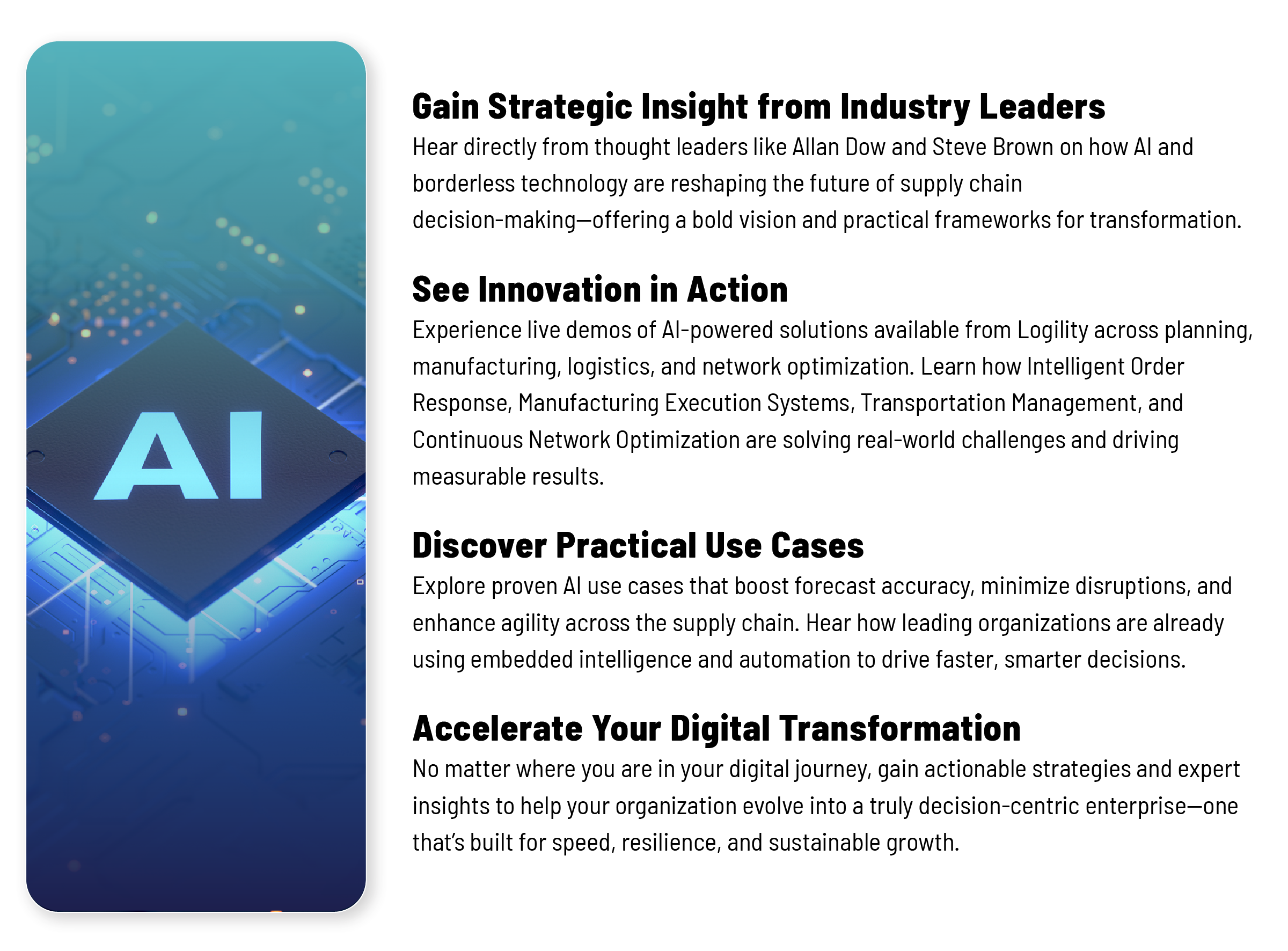 Join top supply chain leaders for a half-day deep dive into the Decision Centric Enterprise—where AI and automation are redefining how organizations think, plan, and act. Explore how agentic and generative AI are transforming planning, forecasting, and execution—eliminating silos, boosting agility, and unlocking enterprise-wide intelligence. Gain actionable insights, real-world use cases, and a clear vision for building smarter, connected supply chains.